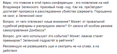 Верю, что главное в этой пресс-конференции – это появление на ней Владимира Зеленского. Красивый пиар-ход. Как же, преЗелдент достигает прогресса в расследовании убийства Шеремета. Порошенко не смог, а Зеленский смог.