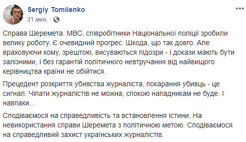 Надеемся на справедливость и установление истины. На неиспользование дела Шеремета в политических целях. Надеемся на справедливую защиту украинских журналистов" – написал глава НСЖУ Сергей Томиленко.