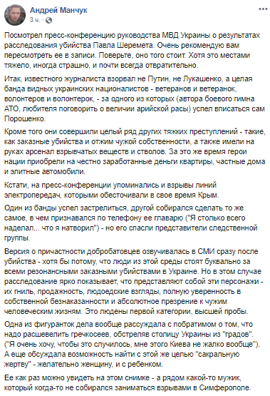 Журналист Андрей Манчук написал, что расследование ярко показывает, что представляют собой подозреваемые в убийстве Шеремета.