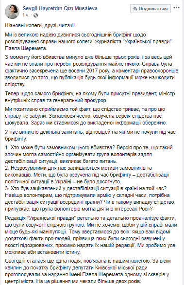 Главный редактор "Украинской правды" (в которой работал Шеремет) Севгиль Мусаева написала, что издание положительно восприняло то, что расследование продолжается, но версия следствия шокировала.