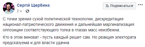 "С точки зрения сухой политической технологии, дискредитация национал-патриотического движения и дальнейшая маргинализация оппозиции соответствующего толка в глазах масс неизбежна. Кто в этом виноват – пусть каждый решит сам. Но реакция электората предсказуема и для власти удачна", – написал журналист Сергей Щербина.