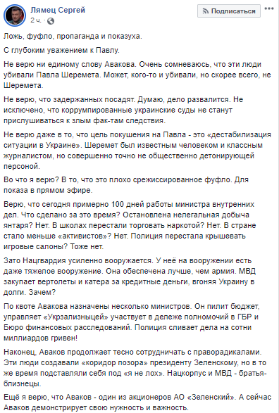 "С глубоким уважением к Павлу. Не верю ни единому слову Авакова. Очень сомневаюсь, что эти люди убивали Павла Шеремета. Может, кого-то и убивали, но, скорее всего, не Шеремета.