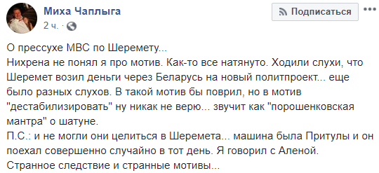 П.С.: и не могли они целиться в Шеремета... машина была Притулы, и он поехал совершенно случайно в тот день. Я говорил с Аленой. Странное следствие и странные мотивы..." – написал политический эксперт Михаил Чаплыга.