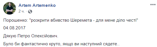 "Порошенко: "Раскрыть убийство Шеремета – для меня дело чести"