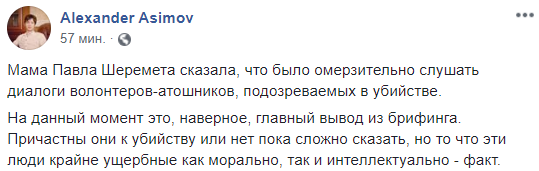 "Мама Павла Шеремета сказала, что было омерзительно слушать диалоги волонтеров-атошников, подозреваемых в убийстве. На данный момент это, наверное, главный вывод из брифинга. Причастны они к убийству или нет, пока сложно сказать, но то, что эти люди крайне ущербные как морально, так и интеллектуально – факт", – написал Александр Асимов.