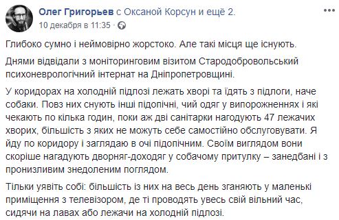 В Стародобровольском психоневрологическом интернате на Днепропетровщине издеваются над пациентами. Об этом пишет адвокат Олег Григорьев на своей странице в Facebook. Он посетил интернат с мониторинговой группой и опубликовал несколько фото из заведения.