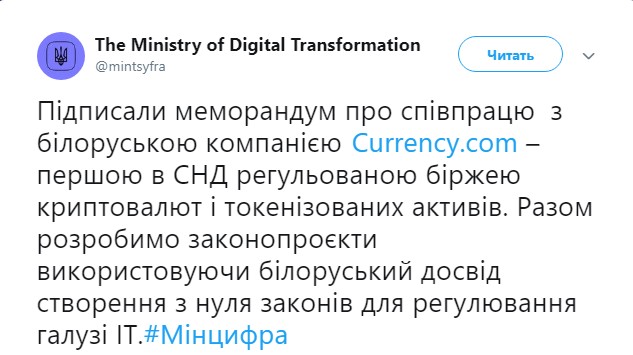 Министерство цифровой трансформации Украины сообщило о подписании меморандума о сотрудничестве с белорусской компанией Currency.com. Об этом в воскресенье сообщила пресс-служба ведомства в Twitter.