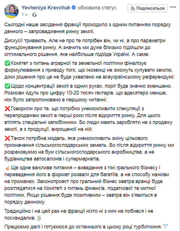 По словам Кравчук, введению рынка земли было посвящено сегодняшнее заседание фракции.