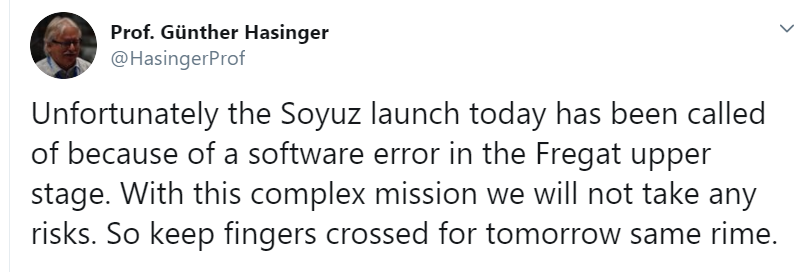 Пуск ракеты-носителя "Союз-СТ" с пятью европейскими спутниками отложен из-за проблем с разгонным блоком "Фрегат". Об этом говорится в Twitter-микроблоге директора по науке европейского космического агентства (ЕСА) Гюнтера Хазингера.