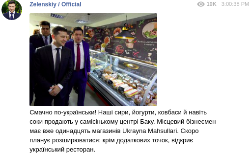 "Вкусно по-украински! Наши сыры, йогурты, колбасы и даже соки продают в самом центре Баку. Местный бизнесмен уже одиннадцать магазинов Ukrayna Mahsullari. Скоро планирует расширяться: помимо дополнительных точек, откроет украинский ресторан" - говорится в сообщении.