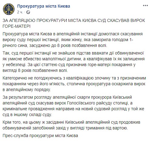Киевская прокуратура добилась отмены приговора суда первой инстанции, который приговорил к 8 годам лишения свободы женщину, заморившую голодом своего годовалого сына.