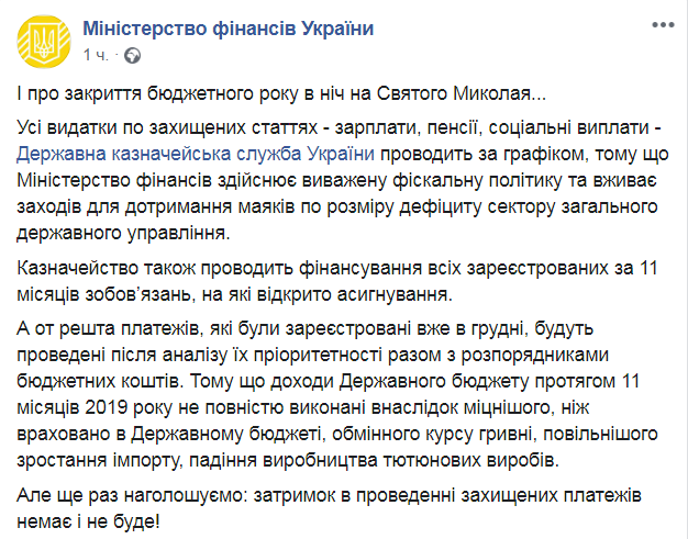 "Потому что доходы Государственного бюджета за 11 месяцев 2019 полностью не выполнены вследствие более крепкого, чем учтено в Государственном бюджете, обменного курса гривны, медленного роста импорта, падения производства табачных изделий", говорится в сообщении.