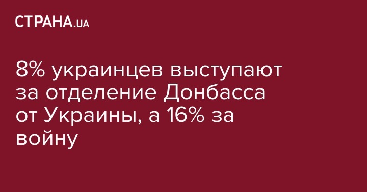Как сообщается, лишь 8% респондентов выступили за полное отделение Донбасса от Украины. С другой стороны продолжение военных действий до полного восстановления украинской власти на Донбассе поддерживают 16%.