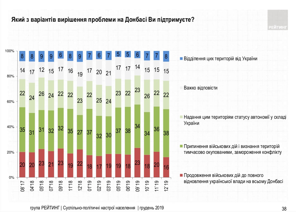 В исследовании говорится о том, что большинство опрошенных выступают за замораживание конфликта на Донбассе – с признанием оккупированного статуса неподконтрольных территорий. Такой сценарий поддерживают 38% украинцев.