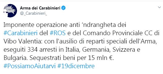 Полиция Италии задержала более 300 человек во время масштабной спецоперации против криминального клана Ндрангета.  Об этом сообщает пресс-служба местной полиции в Twitter.