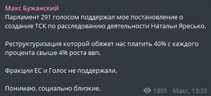 "Парламент 291 голосом поддержал мое постановление о создание ТСК по расследованию деятельности Натальи Яресько, реструктуризация которой обяжет нас платить 40% с каждого процента свыше 4% роста ВВП", - написал Бужанский.
