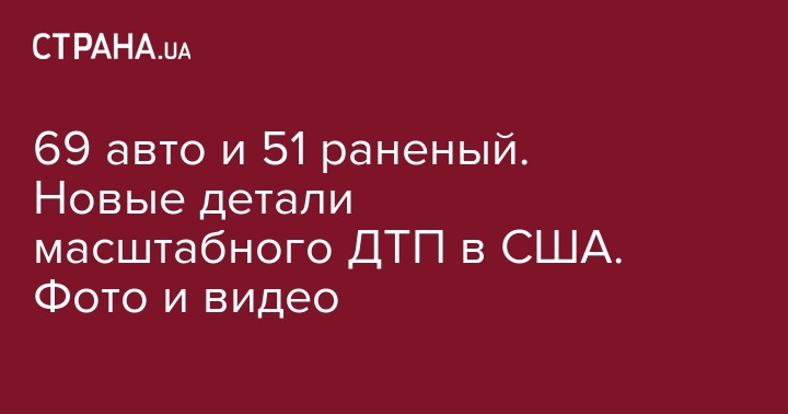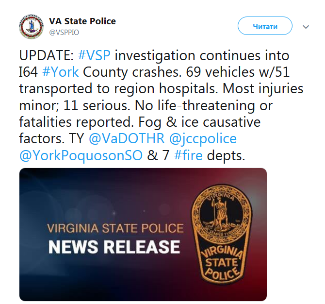 Стали известны новые подробности масштабного ДТП, которое произошло на автотрассе в восточной Вирджинии, в 50 милях от Ричмонда. По уточненным данным полиции здесь столкнулись 69 автомобилей (ранее сообщалось о 35 авто - Ред.), в аварии пострадал 51 человек. Погибших нет, но 11 из 51 пострадавших находятся в тяжелом состоянии.