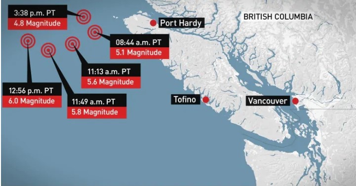 В понедельник, 23 декабря, на территории Канады случилось пять землетрясений в провинции Британская Колумбия. Эпицентр землетрясений находился в 100 км от города Порт Харди. Об этом сообщает CBC