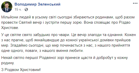 "Миллионы людей во всем мире сегодня собираются семьями, чтобы вместе провести Сочельник и встретить первую звезду. Она сообщает о Рождестве Христовом. В этот светлый праздник забудем о ссорах. Это вечер согласия и единения. Каждый из нас хочет, чтобы как можно быстрее в каждый украинский дом пришел мир", - написал Зеленский.