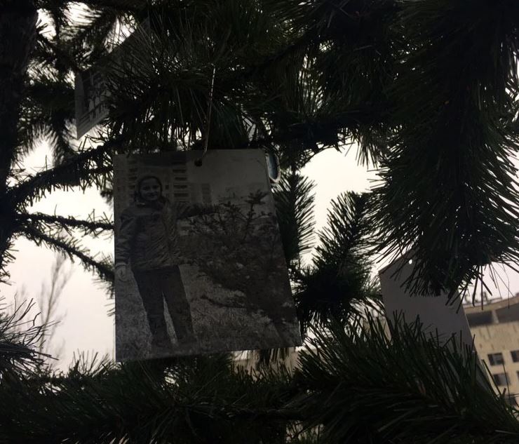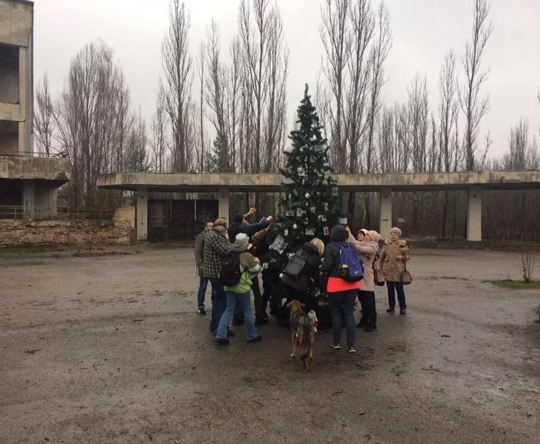 Елку установили около дворца культуры "Энергетик". Бывшие жители города специально приехали в зону отчуждения, украсили праздничное дерево новогодними игрушками и своими детскими фотографиями.