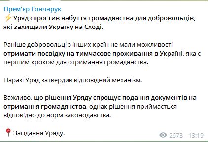 "Правительство упростило получение гражданства для добровольцев, которые защищали Украину на Востоке", - написал Гончарук во вторник, отметив, что ранее добровольцы из других стран не имели возможности получить вид на жительство в Украине, который является первым шагом для получения гражданства.