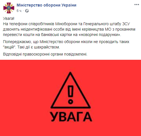 "На телефоны сотрудников Минобороны и Генерального штаба ВСУ звонят неидентифицированных лица от имени руководства МО с просьбой перевести средства на банковские карточки на "новогодние подарки". Предупреждаем, что Министерство обороны никогда не проводит таких "акций". Такие действия являются мошенничеством", - говорится в сообщении.