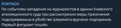 "По событиям нападения на журналистов в здании Киевского апелляционного суда при рассмотрении меры пресечения подозреваемым в убийстве Шеремета вручено подозрение. Первый фигурант пошёл", - написал он.