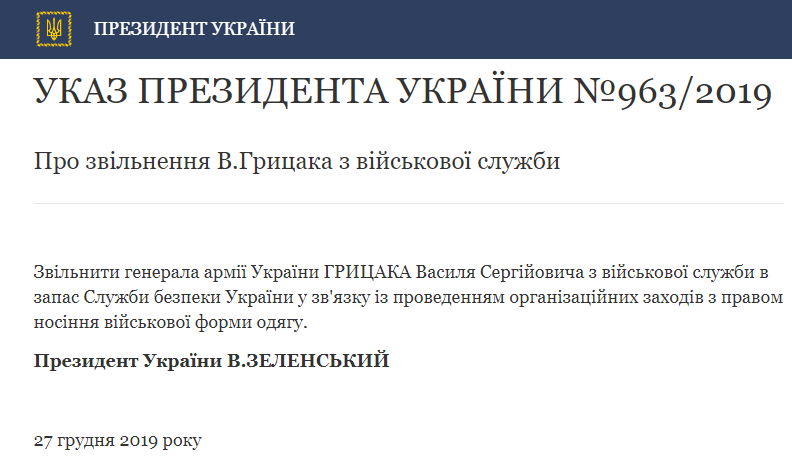 "Уволить генерала армии Украины Грицака с военной службы в запас Службы безопасности Украины в связи с проведением организационных мероприятий с правом ношения военной формы одежды", - говорится в Указе.
