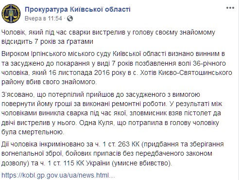 "Мужчина, который во время ссоры выстрелил в голову своему знакомому, отсидит 7 лет за решеткой. Приговором Ирпенского городского суда Киевской области признан виновным в и осужден к наказанию в виде 7 лет лишения свободы 36-летнего мужчину, который 16 ноября 2016 года в с. Хотел Киево-Святошинского района убил своего знакомого", - говорится в сообщении.