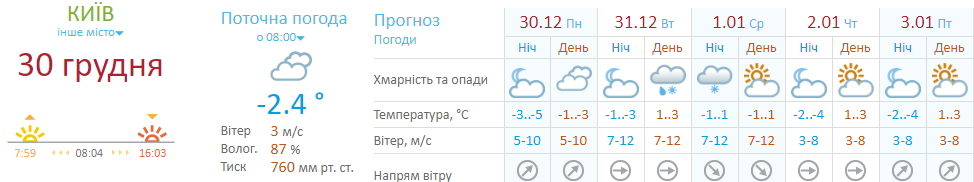 Сегодня, 30 декабря, в Украине ожидается погода без существенных осадков, местами пройдет небольшой снег. Температура воздуха в течение суток будет колебаться в пределах от 13° мороза до 5° тепла. Об этом сообщают в Укргидрометцентре.