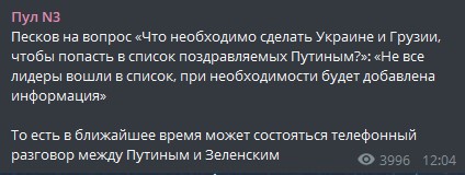 Как сообщается, Песков на вопрос "Что необходимо сделать Украине и Грузии, чтобы попасть в список поздравляемых Путиным?": "Не все лидеры вошли в список, при необходимости будет добавлена информация".