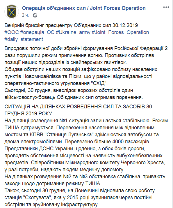 27 декабря "Страна" приводила сводку ООС, согласно которой в тот день 17 раз были обстреляны украинские позиции и ранен военный.