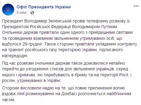 "Во время разговора главы государств также договорились немедленно перейти к согласованию списков для освобождения украинцев, среди прочего и крымчан, которые находятся в Крыму и на территории России, и россиян, удерживаемых в Украине. Стороны выразили надежду на то, что полное прекращение огня вдоль линии разграничения на Донбассе начнется в ближайшее время", - подчеркивается в сообщении.