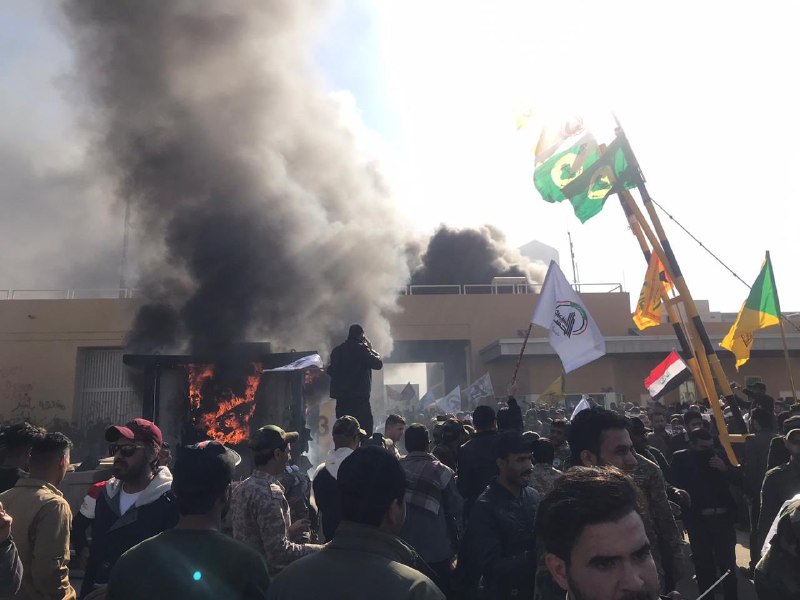Протестующие в Багдаде штурмуют американское посольство в знак осуждения авиаударов по шиитскому ополчению. Они подожгли забор, устраивают массовые беспорядки.