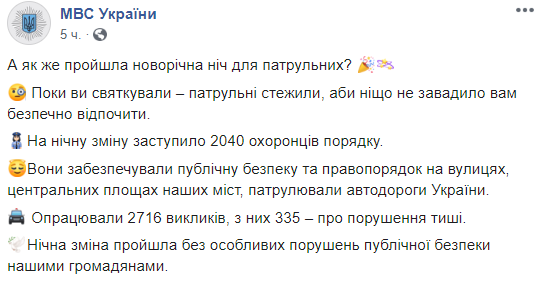 Силовики обеспечивали публичную безопасность и правопорядок на улицах, центральных площадях наших городов, патрулировали автодороги Украины. Отработали 2716 вызовов, из них 335 - о нарушении тишины. Ночная смена прошла без особых нарушений публичной безопасности нашими гражданами, - говорится в сообщении.