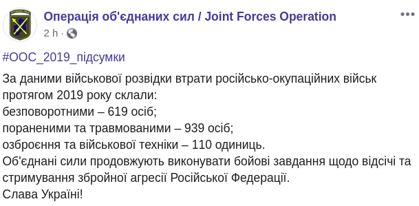 По данным военной разведки, потери противника в течение 2019 составили: