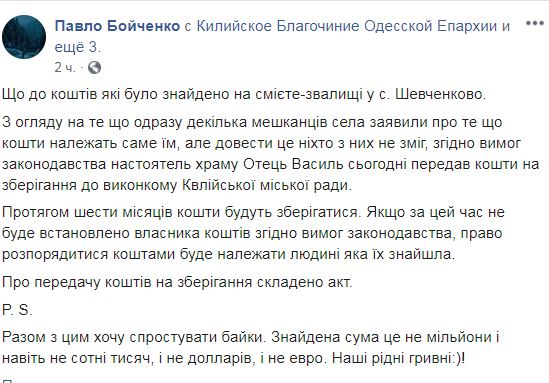 "Учитывая то, что сразу несколько жителей села заявили о том, что средства принадлежат именно им, но доказать это никто из них не смог, согласно требованиям законодательства настоятель храма отец Василий передал средства на хранение. В течение шести месяцев средства будут храниться. Если за это время не будет установлен владелец средств, в соответствии с требованиями законодательства, право распорядиться деньгами предоставят человеку, который их нашел", - написал Павел Бойченко и уточнил, что речь идет о сумме не миллион долларов или евро, а несколько тысяч гривен.