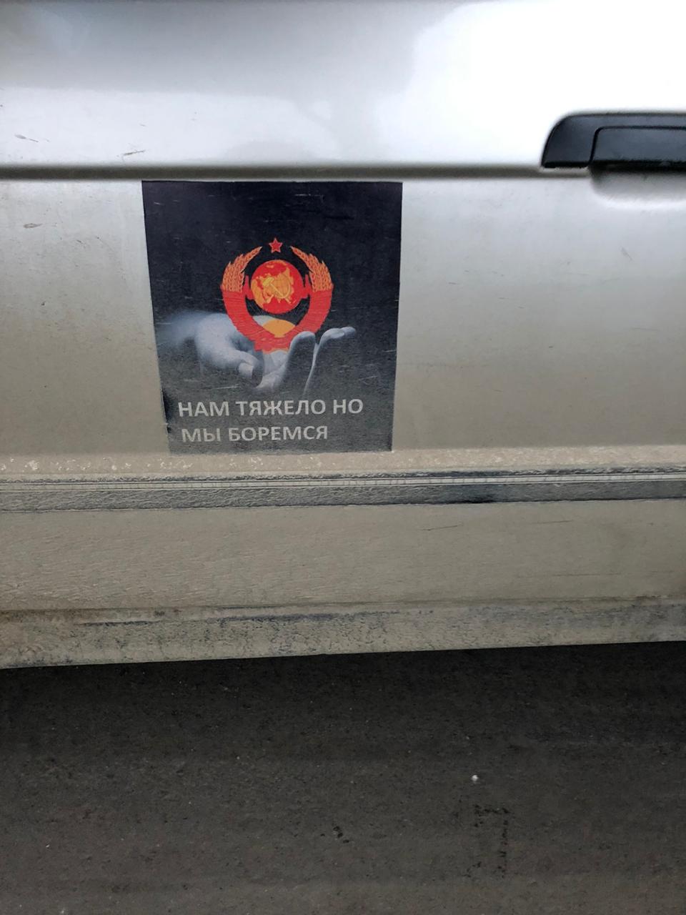 Так, на корпусе машины был большой советский герб, сбоку - наклейка с меньшим гербом и надписью: "Нам трудно, но мы боремся". Аналогичная символика (герб) была на номерных знаках.