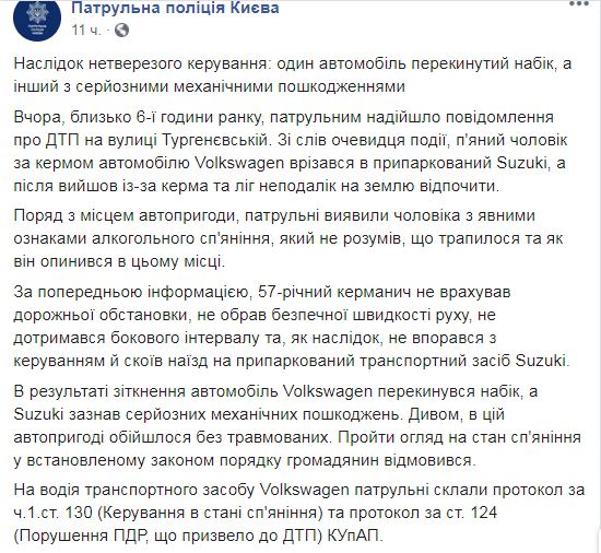 Мужчина за рулем автомобиля Volkswagen врезался в припаркованный Suzuki, а после вышел из-за руля и лег рядом на землю отдохнуть. Об этом сообщили в патрульной полиции Киева в Facebook.