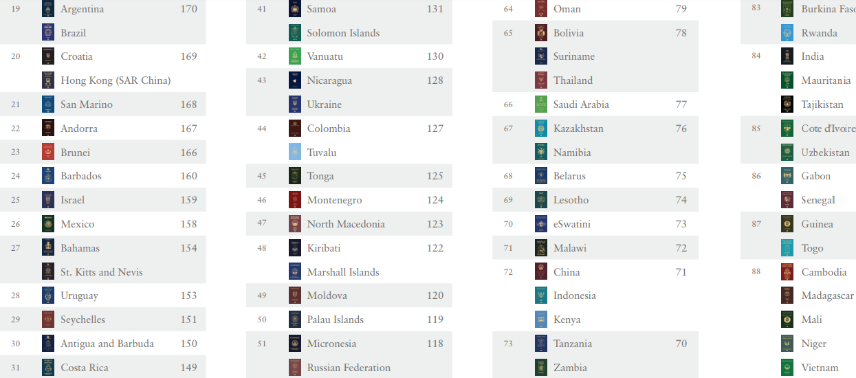 На 4-м месте Италия, тогда как пятое делят между собой Дания, Люксембург и Испания. США и Великобритания, которые еще 5 лет назад бел мировыми лидерами, занимают 8 место. Аутсайдером рейтинга является Афганистан (26 безвизовых стран).