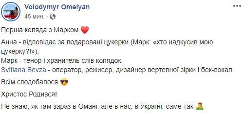 Вместе с супругой Светланой Бевзой в честь Рождества Омелян поставил настоящий вертеп с колядками и бек-вокалом. Об этом был еще один его пост, в котором он подколол Владимира Зеленского за его поездку в Оман.
