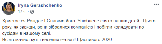 Соглава фракции "Европейская солидарность" Ирина Геращенко отметила, что Рождество - любимый праздник детей, которые по традиции колядовали по соседям в селе. "Всем вкусной кутьи и веселых праздников! Счастливого 2020 года", - пожелала политик.