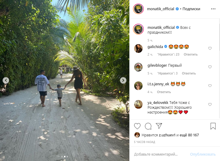 Популярный исполнитель Дима Монатик также поздравил всех с праздниками. Судя по фото, певец празднует Рождество на островах с женой и детьми.