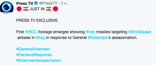 Телеканал сообщил в Twitter, что появились первые кадры, на которых виден запуск ракет по американской авиабазе "Эйн-аль-Асад" на западе Ирака, который стал "ответом на убийство генерала Сулеймани".