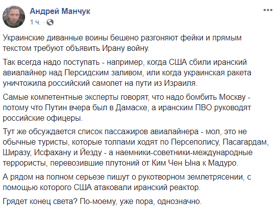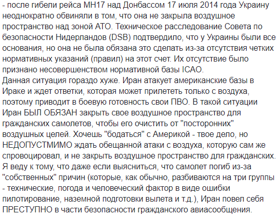 "Ужасная история с падением Boeing 737-800, особенно учитывая параллельный ракетный обстрел Ираном военной базы в США и закрытие американцами воздушного пространства над Ираном и Ираком, выглядит подозрительно", -пишет Арьев.