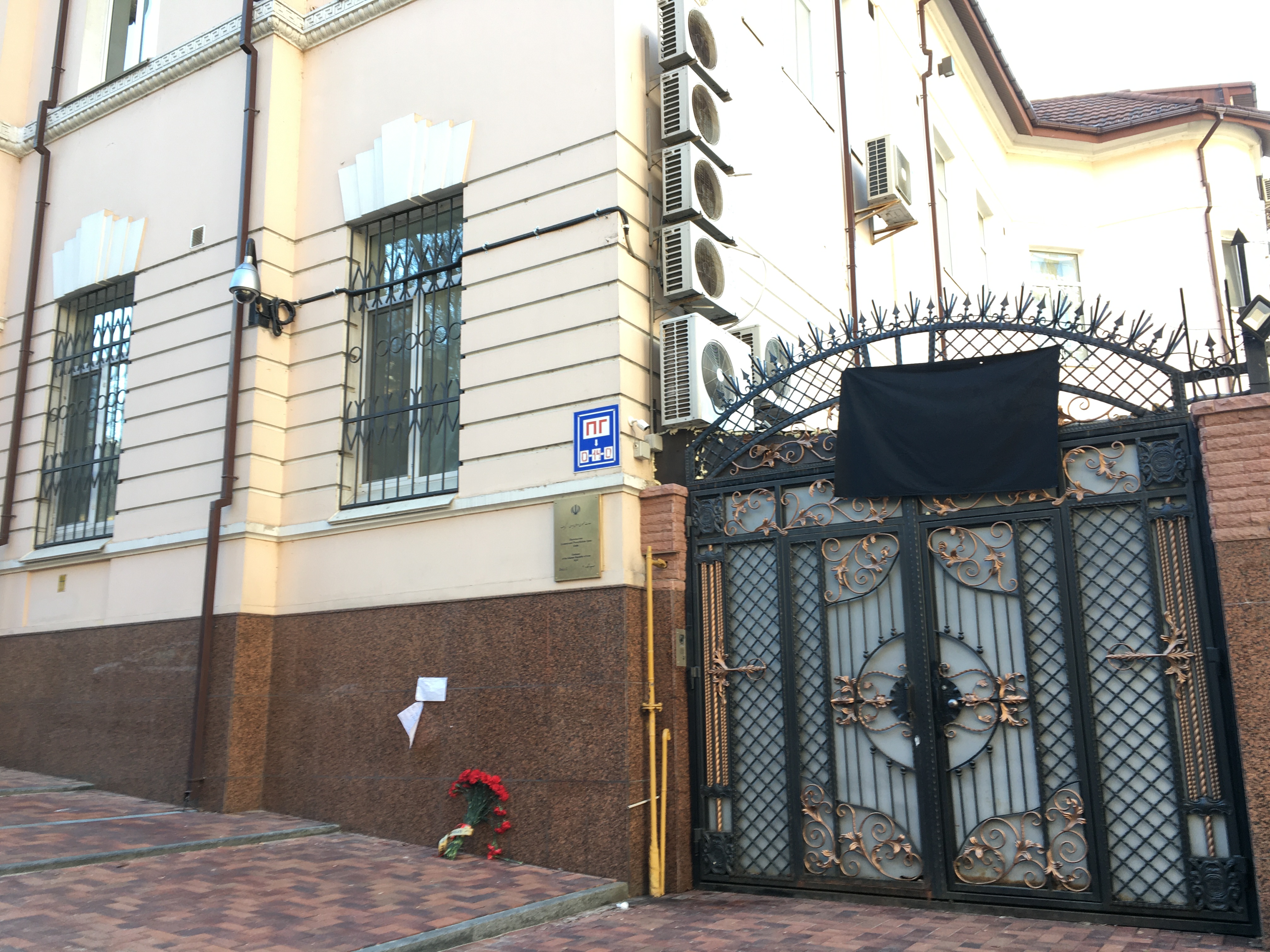 12:42 А вот у посольства Ирана уже кто-то положил букет гвоздик.