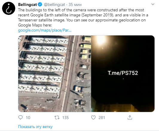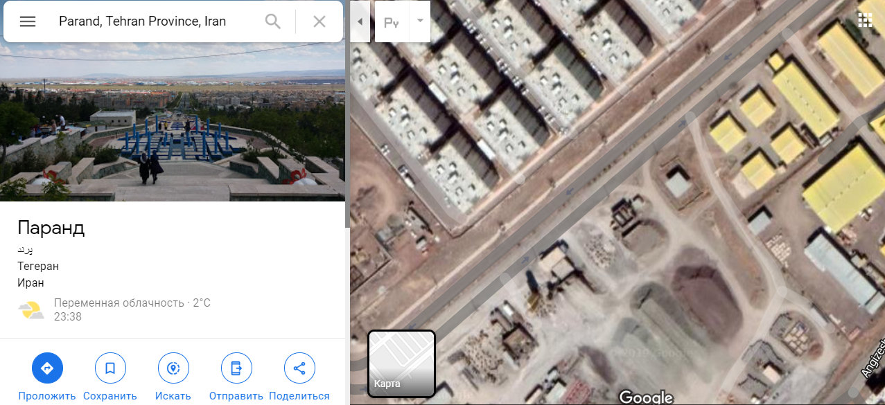 "Здания слева от камеры были построены по последнему спутниковому снимку Google Планета Земля (сентябрь 2019 г.) и видны на спутниковом снимке Terraserver. Вы можете увидеть наше приблизительное местоположение на Картах Google здесь: (Parand, Tehran Province, Iran)", - говорится в сообщении Bellingcat в Twitter.