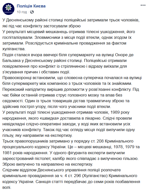 В субботу, 11 января, в Деснянском районе Киева вспыхнул уличный инцидент, который перерос в перестрелку. ЧП случилось на улице Оноре де Бальзака и в результате был ранен местный житель. Стрелкам хоть и удалось поначалу сбежать с места преступления, но их вскоре нашли и задержали.