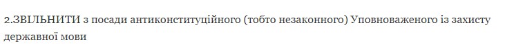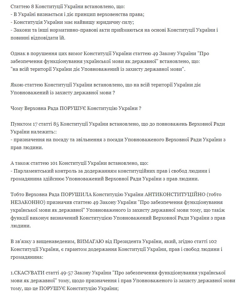 "...требую от Президента Украины, который, согласно статье 102 Конституции Украины, является гарантом соблюдения Конституции Украины, прав и свобод человека и гражданина: отменить статьи 49-57 Закона Украины "Об обеспечении функционирования украинского языка как государственного" относительно назначения и прав Уполномоченного по защите государственного языка, потому что это нарушает Конституцию Украины. Освободить от должности антиконституционного (то есть незаконного) Уполномоченного по защите государственного языка", - говорится в тексте петиции.
