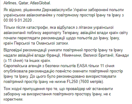 После того, как многие СМИ Украины опубликовали претензии и обвинения в адрес Украэроруха из-за того, что госпредприятие не запретило полеты украинских самолетов в воздушном пространстве Ирана, компания выступила с заявлением и объяснением своей позиции.